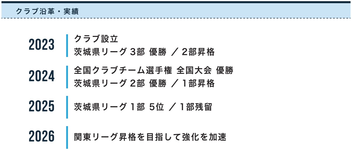 関東リーグ昇格、そして将来的なJリーグ参入に向けて現在もクラブの事業規模を成長させ、2026シーズンからはサッカー給制度の導入、選手が最大限サッカーに集中できるよう就労先の紹介体制の強化も進めています。