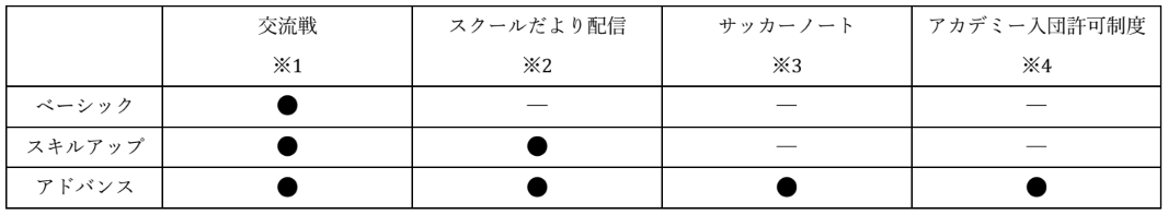 ※2:スキルアップ・アドバンスクラスは毎月スクールテーマを定め、実施いたします。テーマのお知らせや毎月のトレーニングの振り返り、トレーニングの意図を保護者・選手に対して毎月担当コーチより配信いたします。